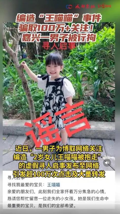 一须眉为博取收集关心“2岁女儿王喵喵被抱走”的虚假寻人启事发布至收集,激发超100万次点击及大量转发。经警方查询拜访此事纯属,该须眉王某某因公共次序被机关依法做出行政的惩罚决定。