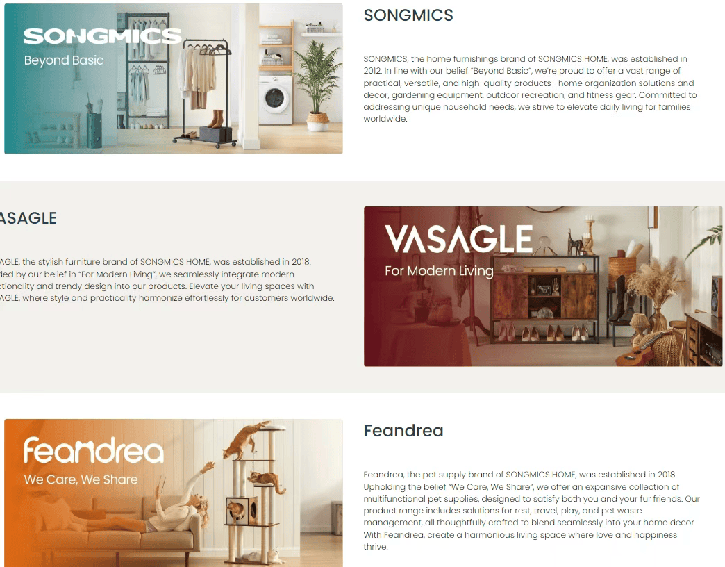 账号内容环绕三大品牌展开:SONGMICS从打家居收纳和天井用品,VASAGLE强调“现代极简设想”,FEANDREA则聚焦“人宠共居”处理方案。好比VASAGLE的视频展现了若何用模块化家具打制现代家居空间,FEANDREA则通过宠物窝、猫爬架等产物传送“宠物也是家庭”的。这种将产物功能取糊口体例连系的内容策略,不只让消费者更曲不雅地领会产物,还潜移默化地传送了品牌价值。
