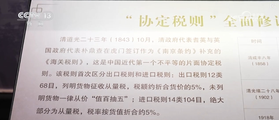 粤海关博物馆办事队陈晓旋引见,从鸦片和平后到1929年,海关一曲施行的是全面的协定税则,协定税则也就是我们的税则和税率都要颠末外国人的同意和核准。反映了列强正在经济上对中国的侵略以及弱国无交际的现实环境。